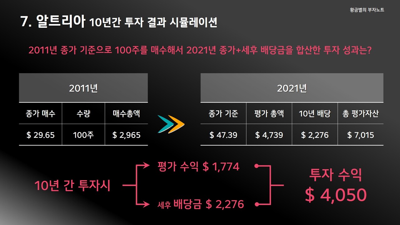 알트리아에 10년 간 투자했다고 가정하고 시뮬레이션을 돌려보겠습니다. 2011년에 알트리아의 주가는 29.65달러, 2021년에는 47.39달러로 상승했고, 알트리아 100주를 10년 간 보유했다면 세후 2,276달러를 배당으로 받았을 것입니다. 평가 수익과 배당금을 더한 총 투자 수익은 4,050달러입니다.