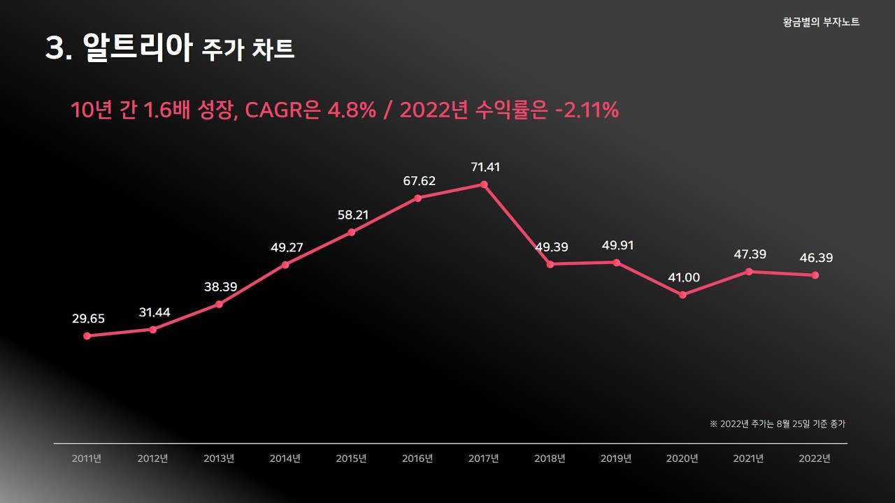알트리아가 53년간이나 배당금을 증액시켜가며 주주에게 수익을 가져다 주기 위해 노력하는 기업이라는 것은 분명합니다. 하지만 8%라는 높은 고배당 뒤에는 ‘죄악주’에 투자하는 마음고생을 견뎌야 합니다. 그래서 이런 죄악주를 장기간 보유하는 것은 좋은 투자가 되지 못할 수도 있습니다. 만약 여러분이 2014년 이전에 매수한 투자자라면 수익구간이겠지만, 만약 2016년이나 2017년 고점에 진입한 투자자라면 지금 큰 마음고생을 하고 있을 테니까요. 그래서 사람의 건강에 해로운 담배라는 기호식품을 취급하는 알트리아 같은 죄악주에 투자하는 건 분명 마음이 편한 투자는 아닙니다. 왜냐하면 항상 이런 건강에 대한 규제나 정치적 이슈에 따른 주가 폭락에 대한 걱정을 해야 하기 때문입니다.