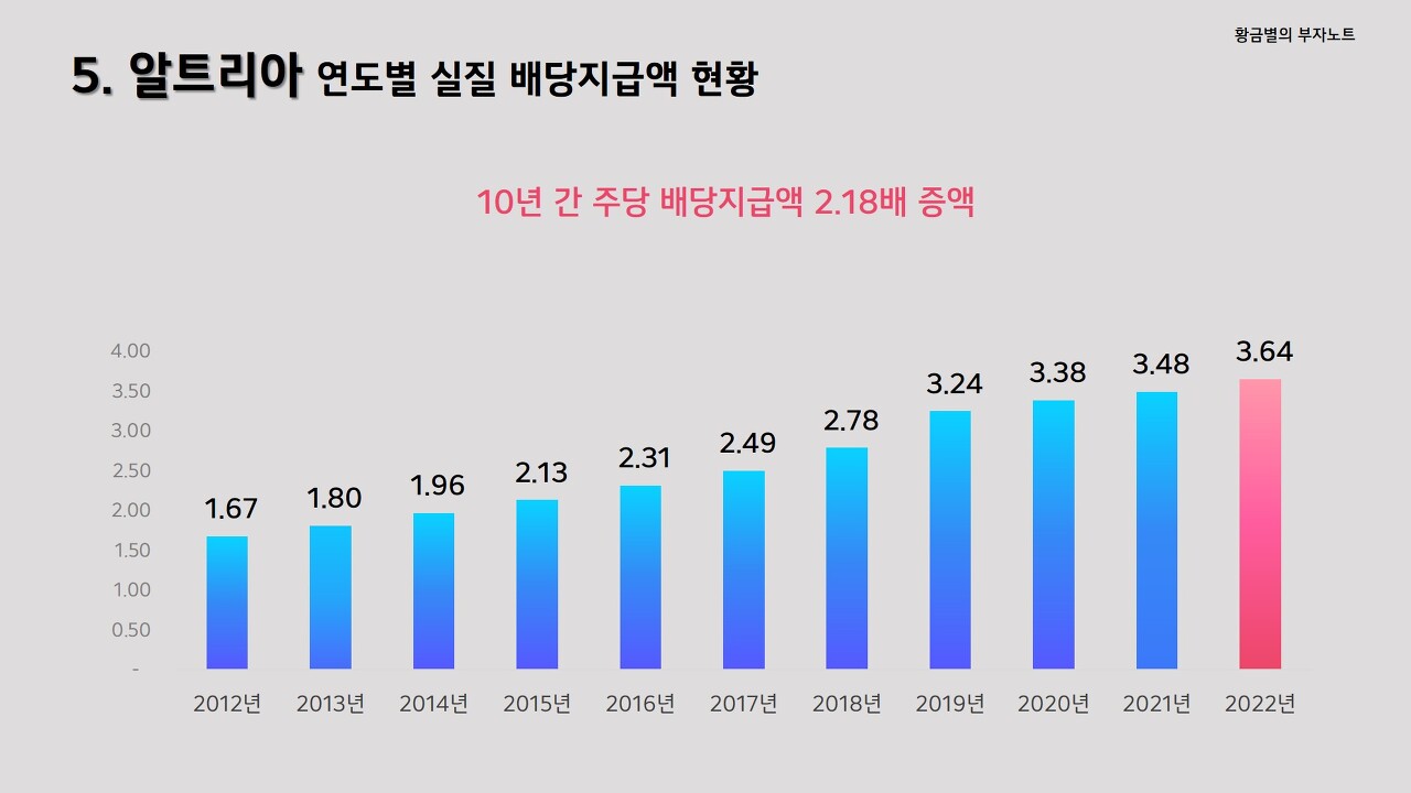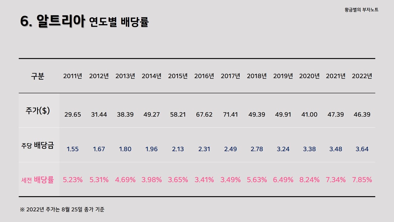 알트리아는 작년 8월 26일에 분기 배당금을 주당 0.86달러에서 0.9달러로 전 분기 대비 4.65% 증가했고, 올해는 주당 0.9달러에서 0.94달러로 4.44% 증가했습니다.
