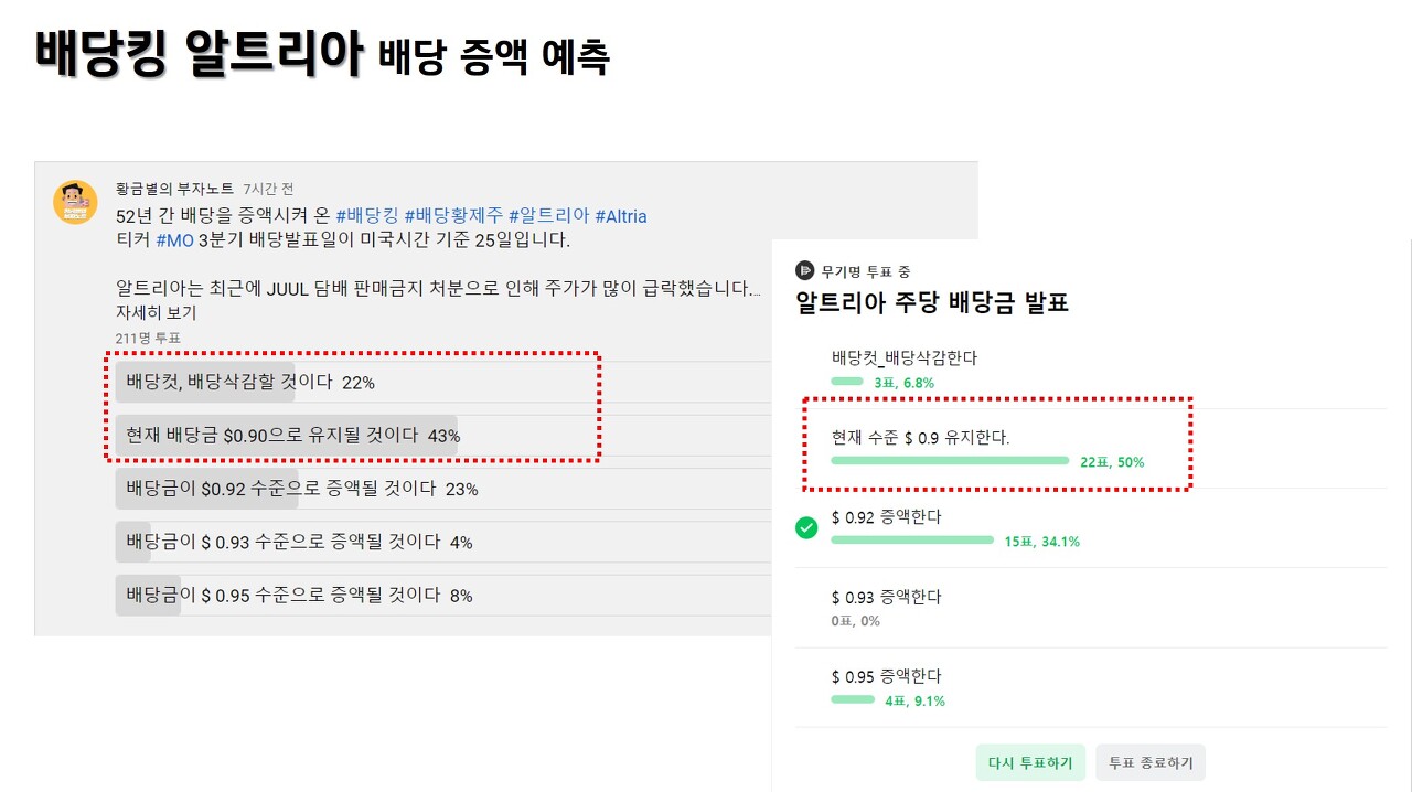 제 유튜브채널 커뮤니티와 ‘미국주식에 미치다‘ 라는 네이버 카페에서 배당 증액 예측에 대해 투표를 해봤는대요, 커뮤니티에서는 43%가 네이버주식카페에서는 50%가 현재 배당수준을 유지할 것이다라고 투표해주셨습니다. 하지만 구독자분들이나 카페회원들의 예측과는 달리 52년간이나 배당을 늘려 온 이 위대한 배당킹 종목은 이번에도 우리의 예상을 뛰어넘고 보기좋게 배당금을 0.94달러로 +4.44%나 증액했습니다.