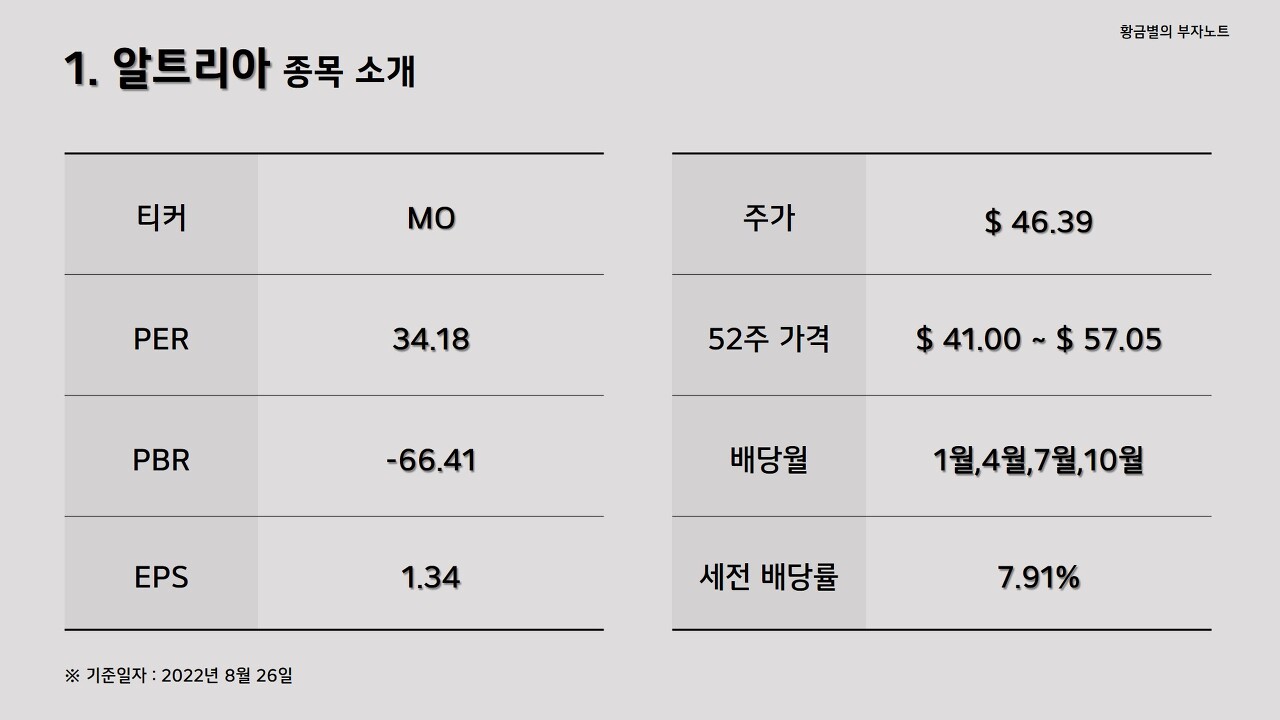 알트리아가 8월 25일 분기 배당금을 발표했는대요. 알트리아의 최근 주가흐름과 배당정보를 전해드리겠습니다.