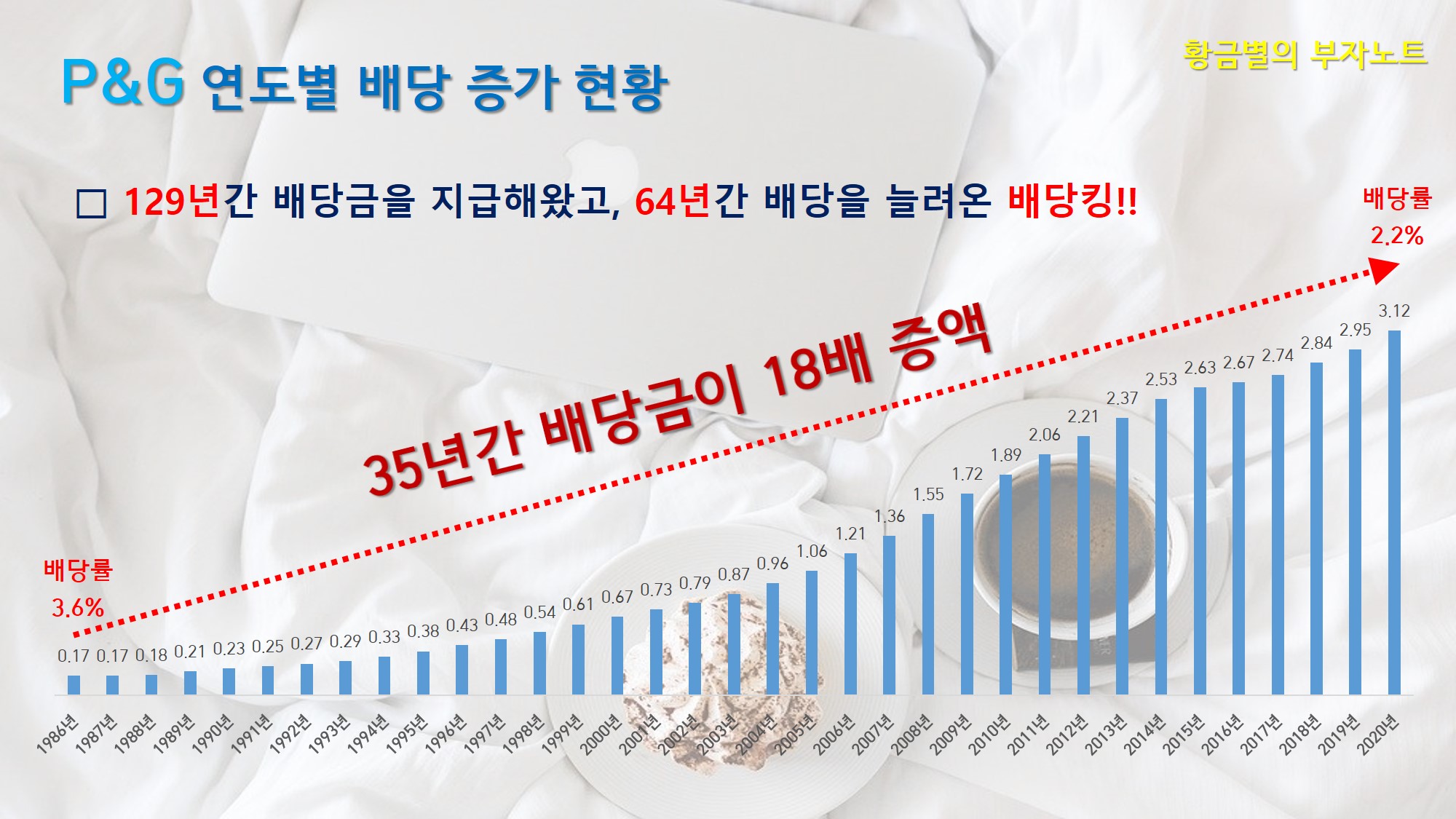 1986년도 피앤지 한주당 가격이 4.77달러였고, 연간 0.17달러를 배당으로 지급해서 세전 배당률이 3.6퍼센트였는데, 2020년 주가는 139.14달러, 주당 3.12달러를 배당금으로 지급해서 2020년 기준 배당률은 2.2퍼센트이고, 2021년 현재는 2.4퍼센트입니다.