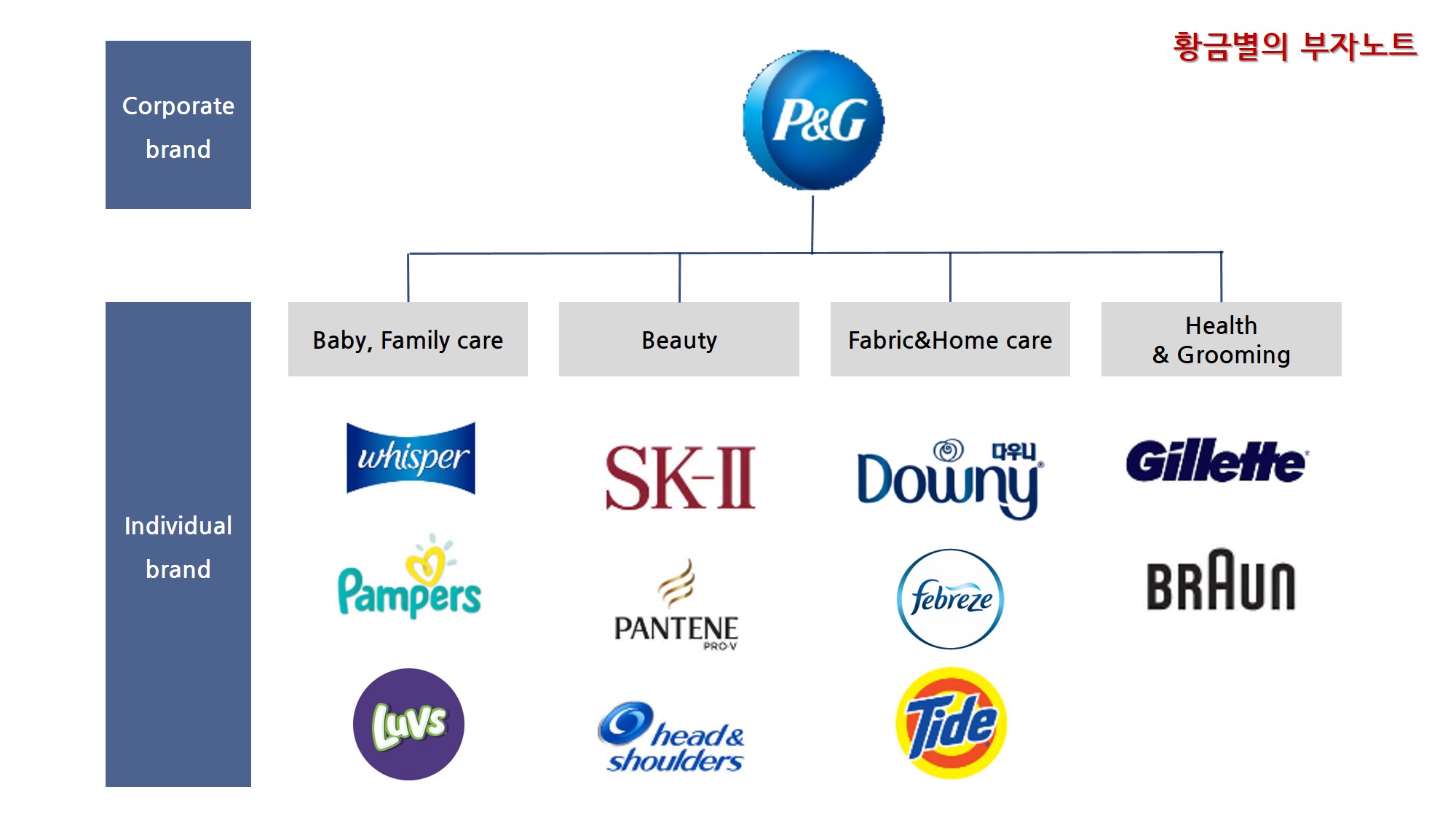 피앤지는 수많은 강력한 개별 브랜드를 보유하고 있어 해당 브랜드들이 피앤지 소유 브랜드라는 것을 일반사람들은 잘 알지 못하는 경우가 많습니다. 예를 들어 다우니 유연제나 팬틴은 워낙 유명하지만 그 브랜드들이 피앤지 기업의 자사 브랜드라는 걸 사람들은 잘 알지 못하죠. 이런 피앤지의 카테고리별 강력한 브랜드 운영 전략은 세계 여러 소비재 업체들의 벤치마킹 요인이 되었습니다. 우리나라 엘지생활건강이 대표적이죠.