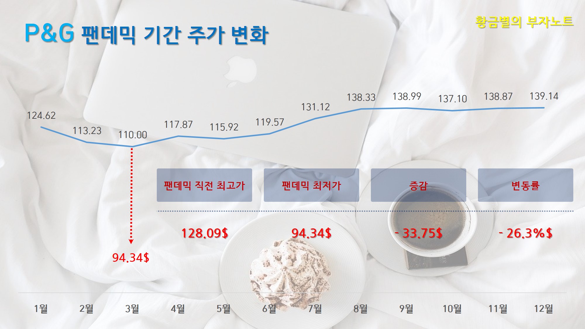피앤지같은 생활필수품 기업은 전통적인 경기방어주에 해당하기 때문에 큰 성장을 기대하긴 어렵습니다. 인플레이션 및 금리인상 우려로 시장이 불확실한 가운데 이런 하락장에서 방어를 할 수 있는 주식이라 포트폴리오내에 안정적인 자산방어를 계획하시는 분들에게 적합한 종목일 듯 합니다.