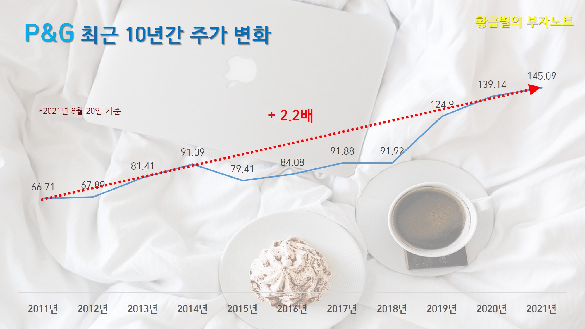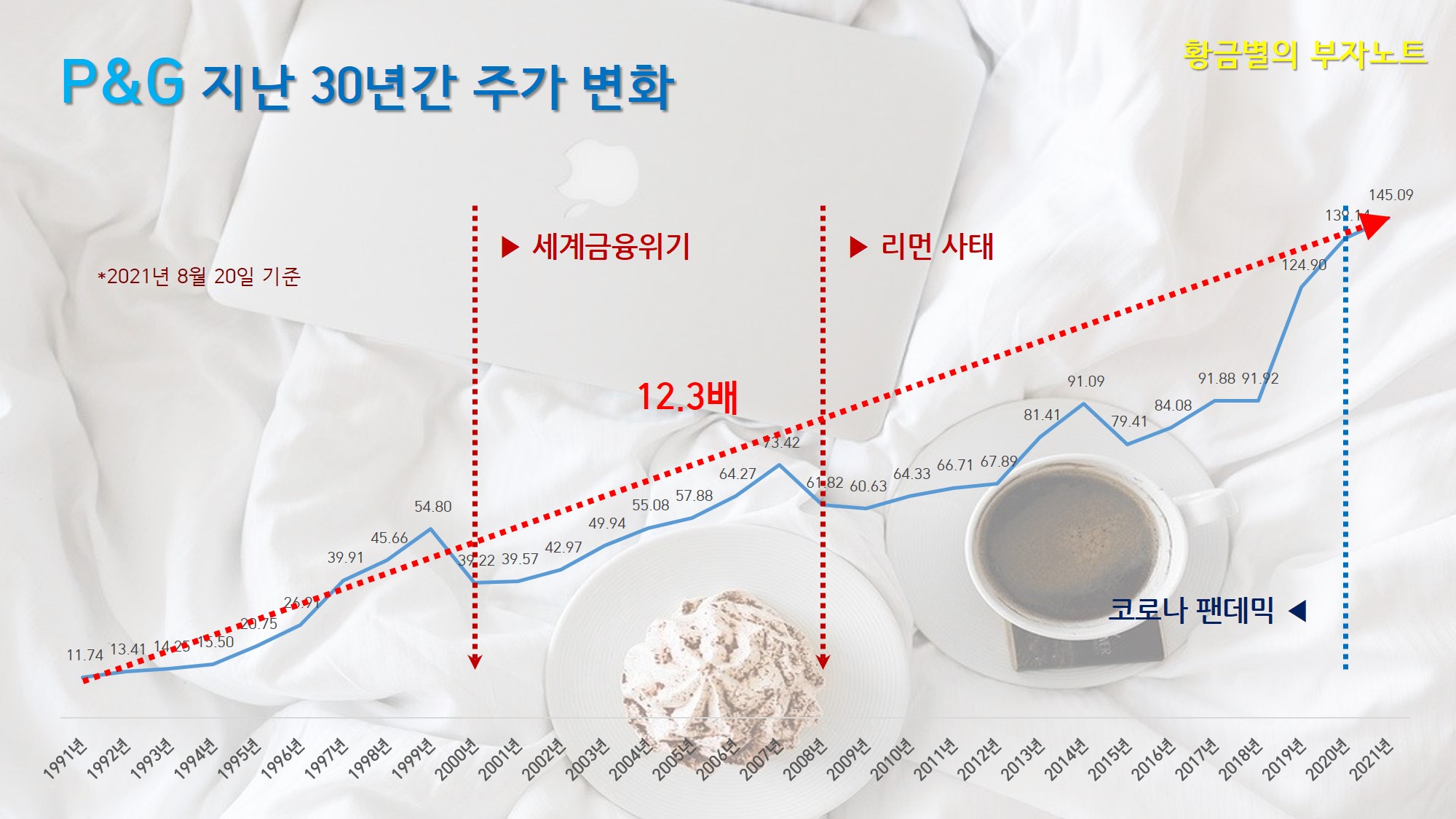 1991년 1주당 11.74달러였던 피앤지의 주가는 2021년 8월 현재 145달러로 지난 30여년간 12.3배 상승했습니다.
