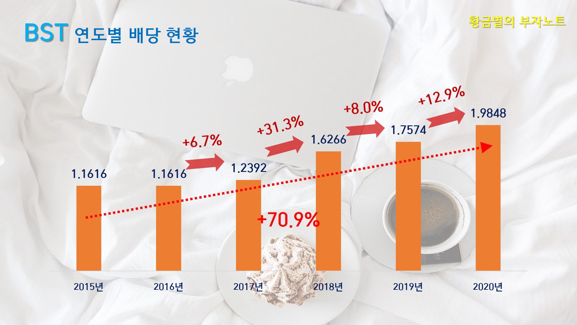 BST의 상장 이후 연도별 배당 지급내역 입니다. BST는 2015년 주당 1.1616달러를 지급했고, 2016년까지는 배당금이 증액되지 않고 현상유지를 했지만, 2017년부터 본격적으로 배당이 증가하기 시작해서 2020년까지 4년 연속 배당금이 증액되었고, 올해로 5년 연속 배당이 증액될 예정입니다.