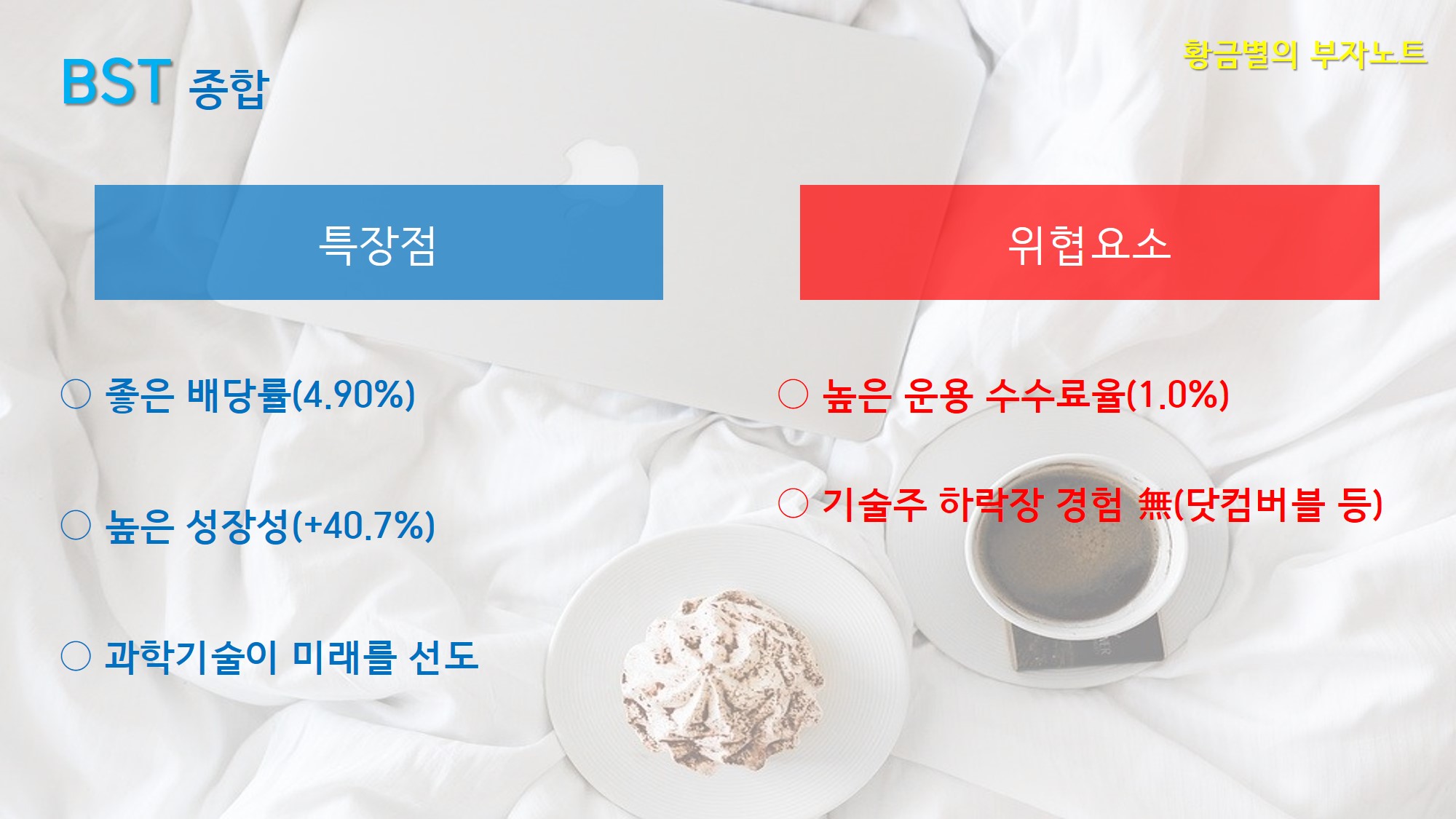 다소 아쉬운 점은 운용 보수가 1퍼센트로 매우 높다는 점이지만, CEF의 특성상 ETF와 달리 주식 매도 외에 옵션 등 파생상품에도 적극적으로 투자하기 때문에 높은 보수는 어찌보면 당연할 수도 있습니다. 지금과 같은 성과만 잘 유지해준다면 운용보수는 큰 문제가 되지 않을 것입니다. 다만 BST의 경우 2014년에 상장되어 닷컴버블이나 금융위기와 같은 기술주의 위기를 경험해보지 않았기 때문에 현재 나스닥 기술주의 거품논란과 더불어 사상 최고점의 주가 수준은 부담이 될 수도 있습니다.