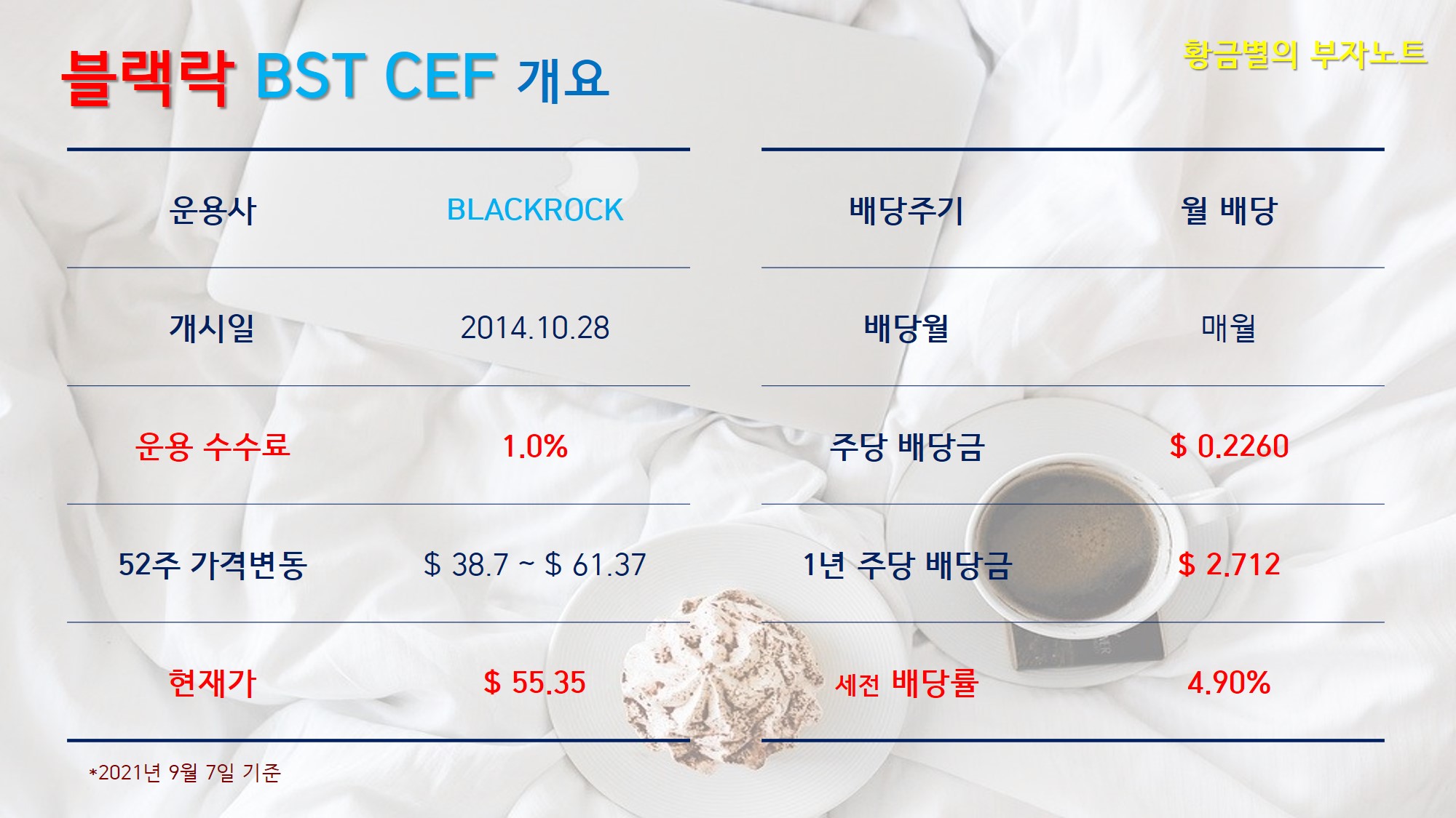 오늘은 세계에서 가장 큰 자산운용사인 블랙락에서 운용하는 CEF인 ‘BST’에 대해 소개드리겠습니다. 일부 구독자 분께서 분석 요청을 주신 ETF기도 하고, JEPI와 함께 최근에 가장 관심있게 지켜보고있는 종목이기도 합니다.