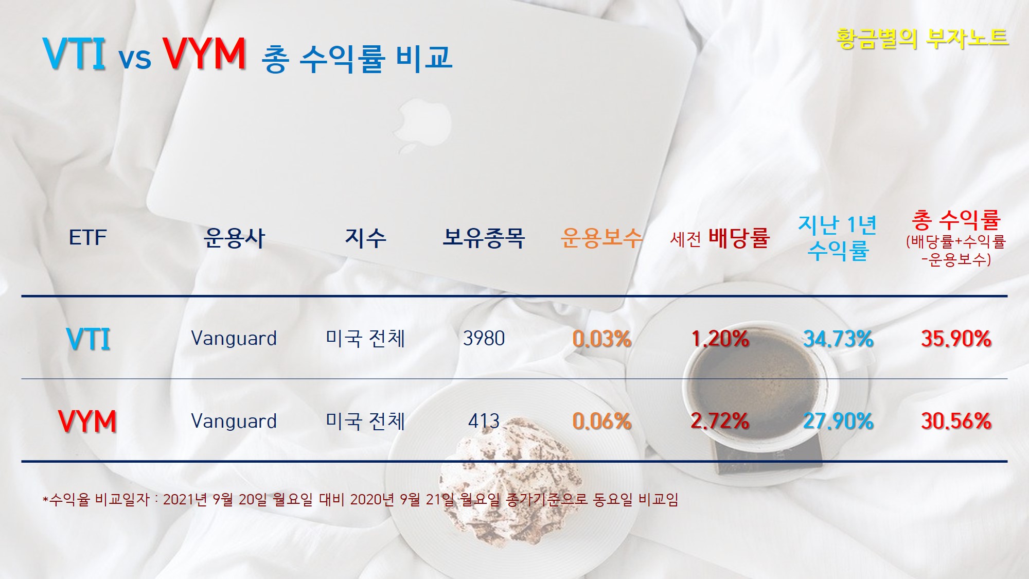 운용보수와 배당률 그리고 지난 1년 수익률을 종합해서 비교해보면 VTI가 35.9%, VYM이 30.56%로 두 ETF 모두 좋은 성과를 나타냈지만, VTI가 약 5%정도 좋은 성과를 보여줬네요.