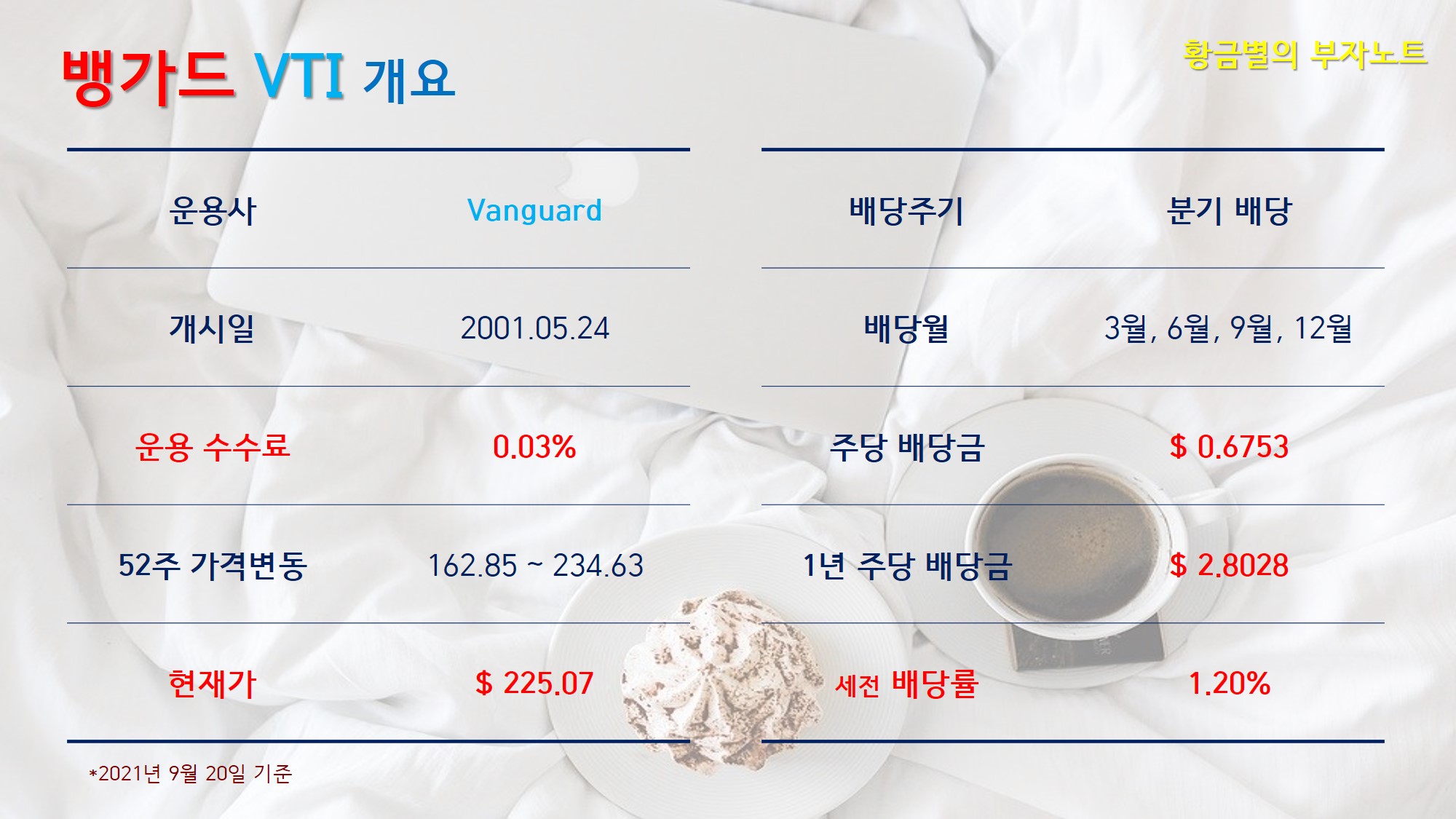 VTI는 세계에서 2번째로 큰 자산운용사인 뱅가드그룹에서 2001년 5월에 출시하였습니다. VTI도 펀드이기 때문에 운용 보수가 낮을수록 좋은데 수수료가 0.3%도 아니고, 0.03%로 매우 낮은 수준입니다. 52주 가격변동은 30% 이상으로 작년 미국 대선시기와 겹쳐 대형 ETF 치고는 다소 출렁거림이 심했습니다.