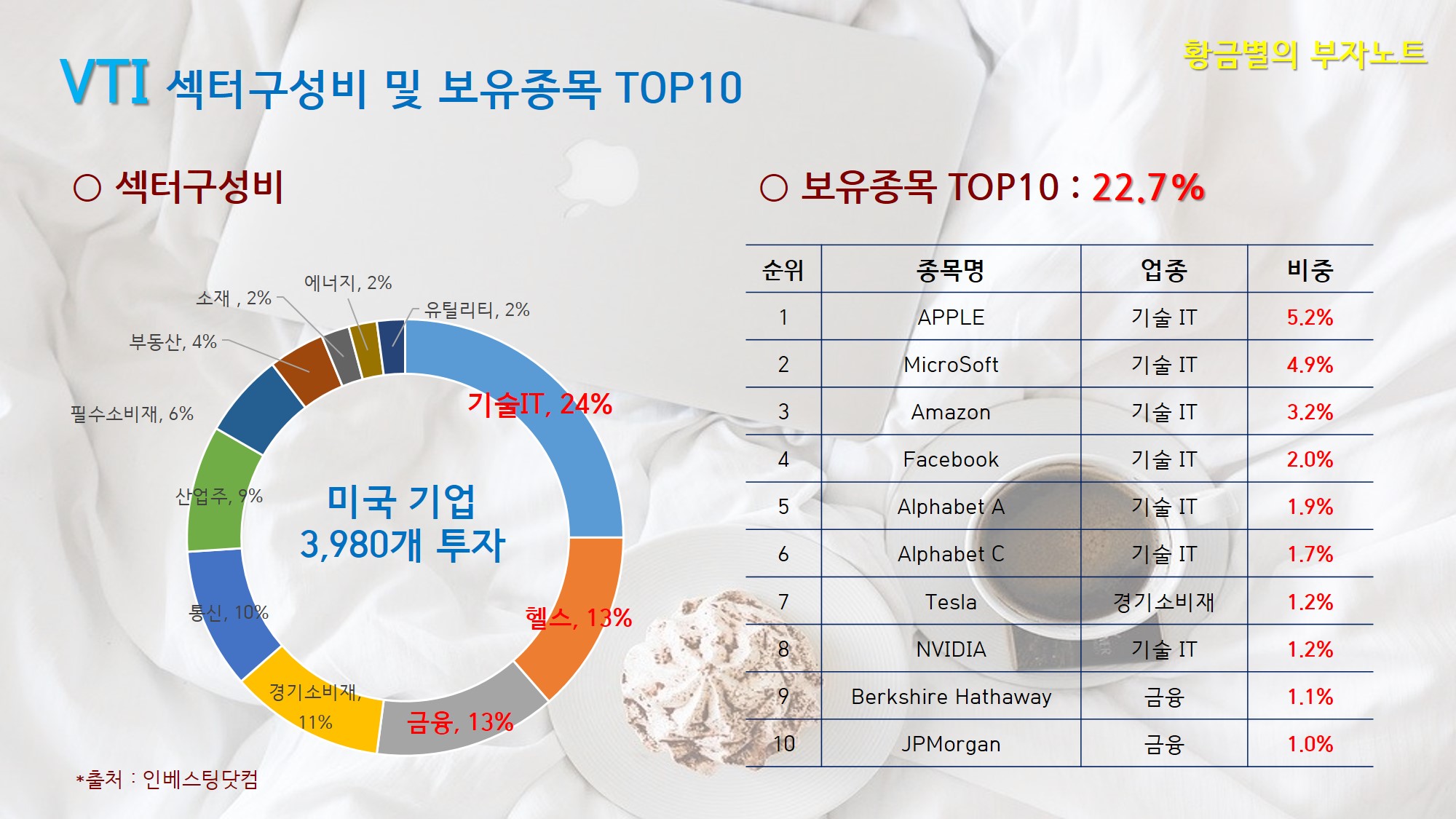 보유종목 탑텐 비중은 22.7%인데, 애플이 5.2% 마이크로소프트 4.9%, 아마존 3.2%, 페이스북 2%, 구글 알파벳 그리고 테슬라와 엔비디아까지 VTI가 기술섹터 구성비가 높은 만큼 세계 최고 기술기업들 투자 점유비가 높습니다.