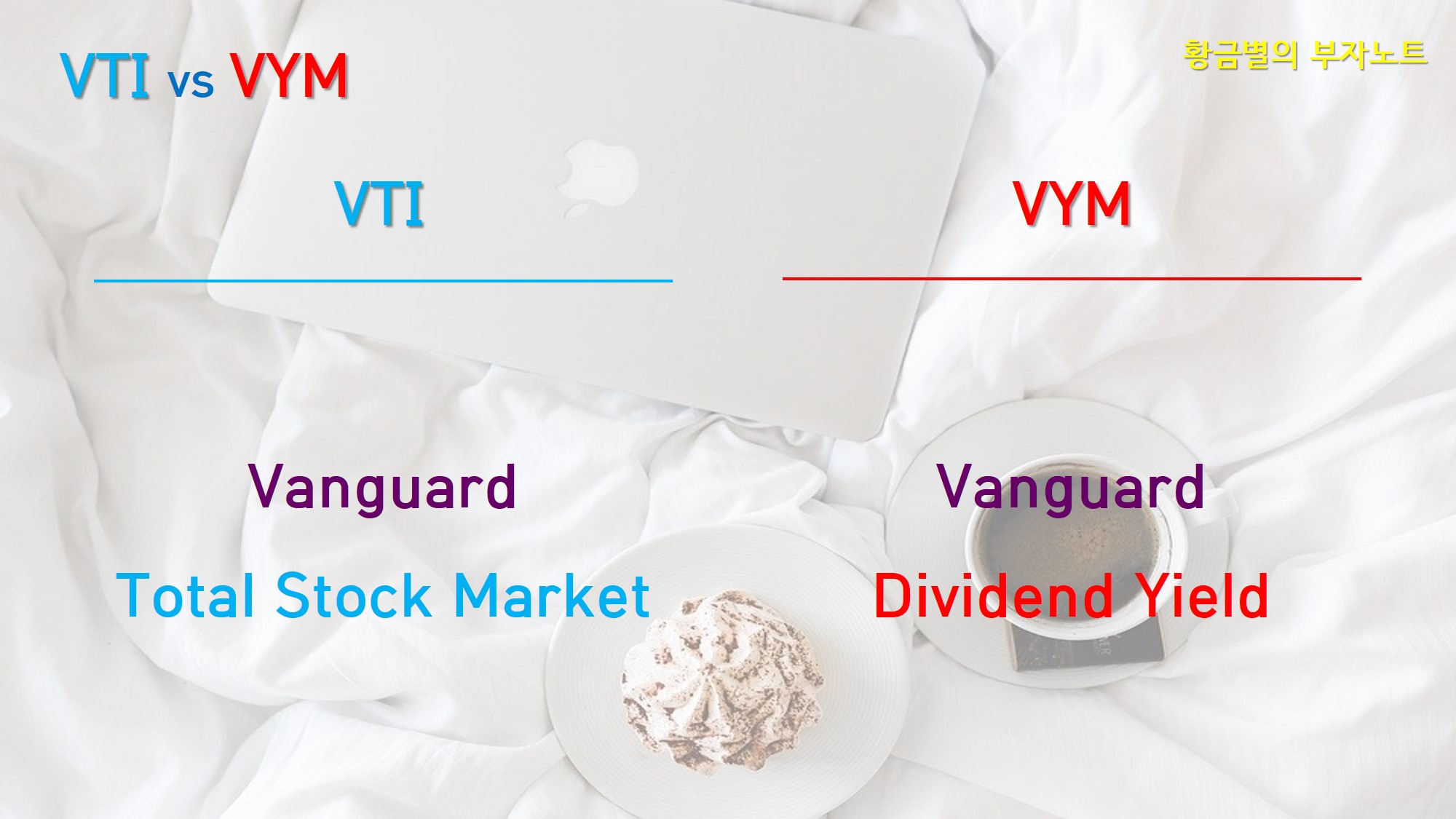 그 중 많은 분들이 궁금해하시는 VTI와 VYM 두개 ETF를 간략하게 비교해드릴게요. VTI는 미국의 Total Market Index의 성과를 추적합니다. 미국 주식시장 전체에 투자하는 거라고 이해하면 됩니다. 반면 VYM은 명칭부터 배당 ETF라고 명명되어있는것처럼, 고배당 수익률 지수의 성과를 추적해서 투자합니다.