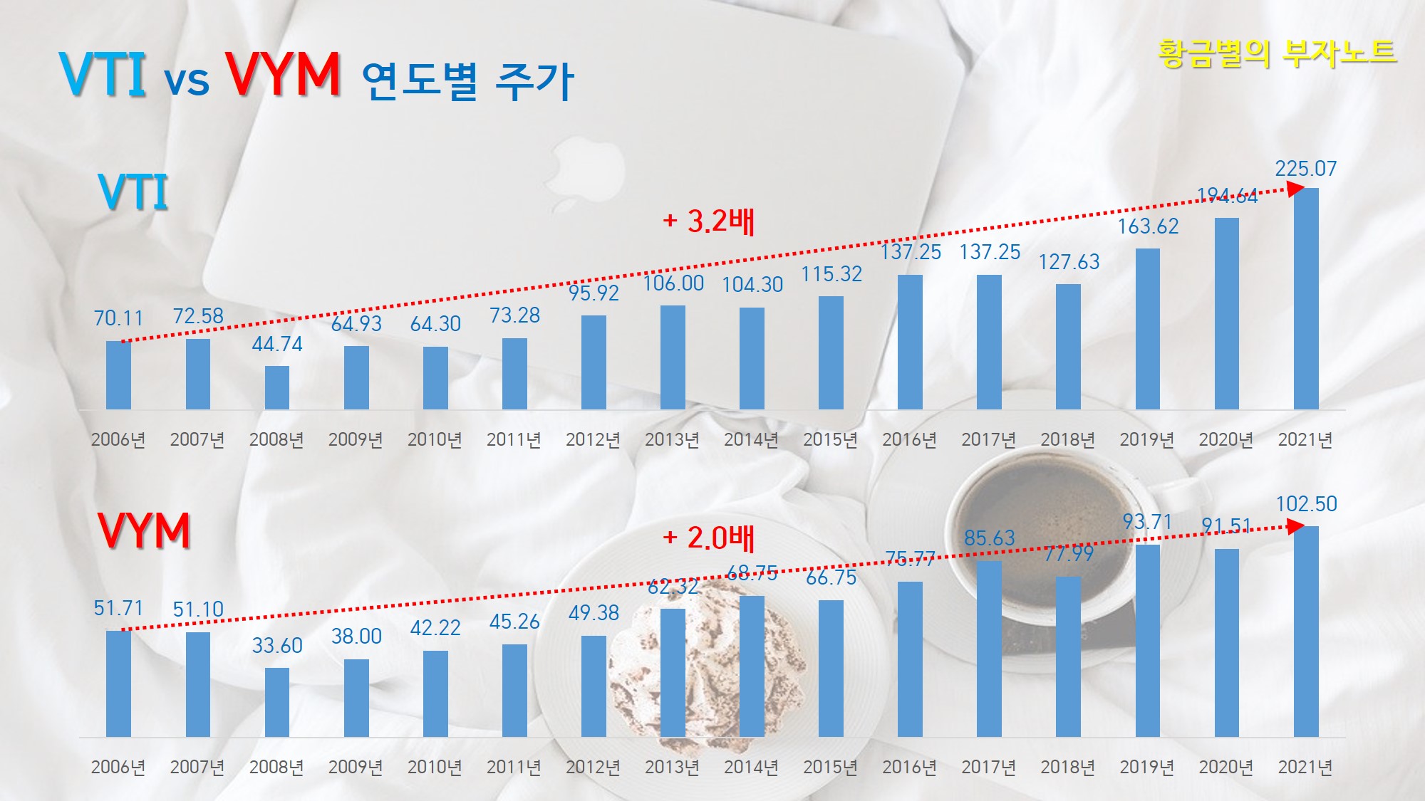 이러한 투자섹터 구성비 차이로 인해 VYM은 2.7%라는 좋은 배당을 지급하며 성장해가고, VTI는 배당보다는 성장에 초점이 맞춰져 있다는 것을 알 수 있습니다.
