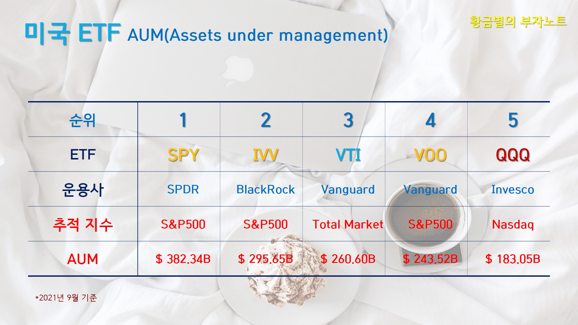 먼저 미국을 대표하는 ETF TOP5에 대해 설명드리겠습니다. 일반 주식도 시가총액이 높으면 대형우량주가 되듯이 ETF 또한 AUM Assets under management 이라는 펀드가 운용하는 자금의 규모로 구분이 됩니다.