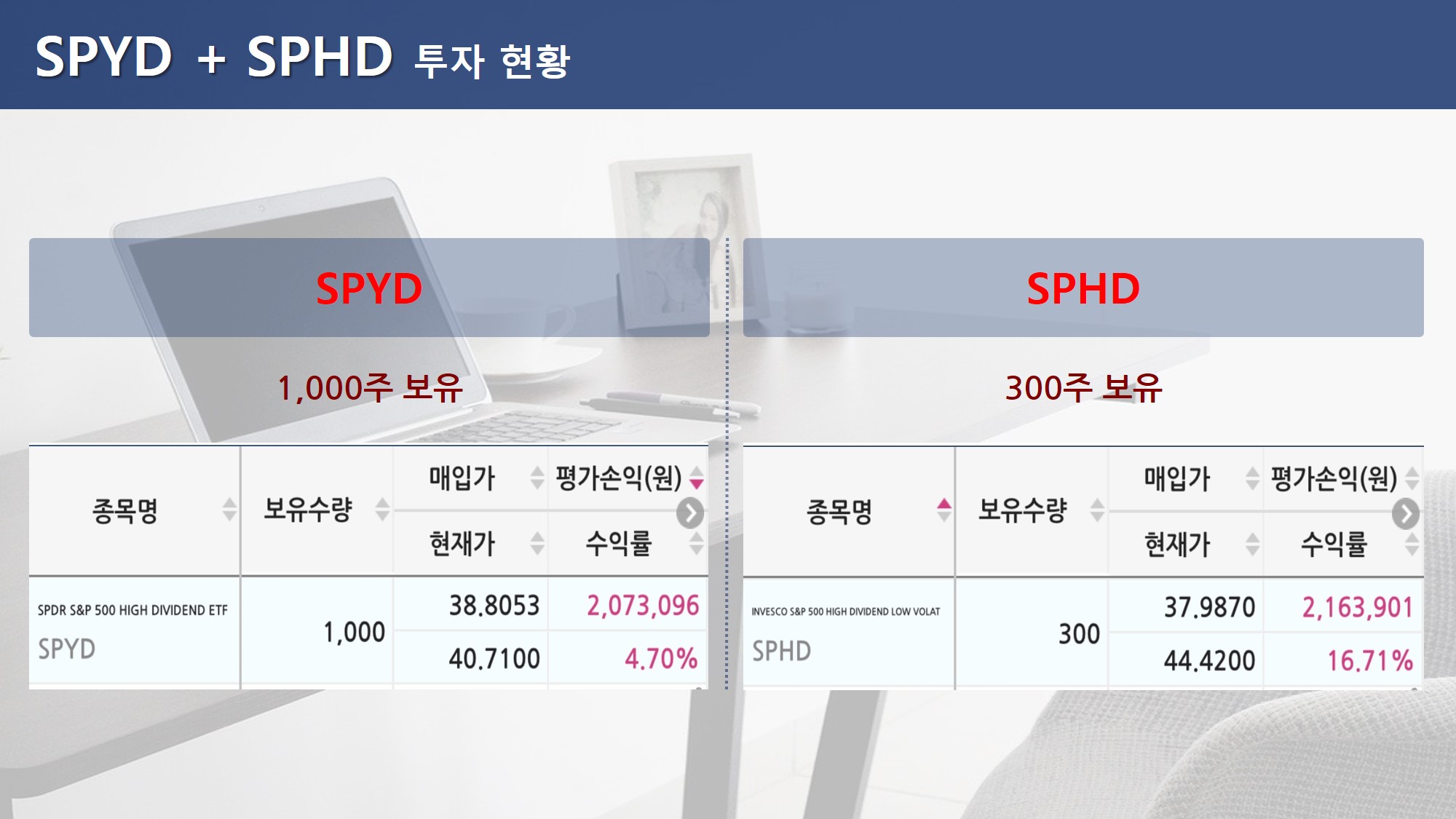 저는 최근에 SPYD를 추가매수해서 1,000주까지 보유수량을 늘렸고, SPHD는 300주를 보유하고 있습니다.
