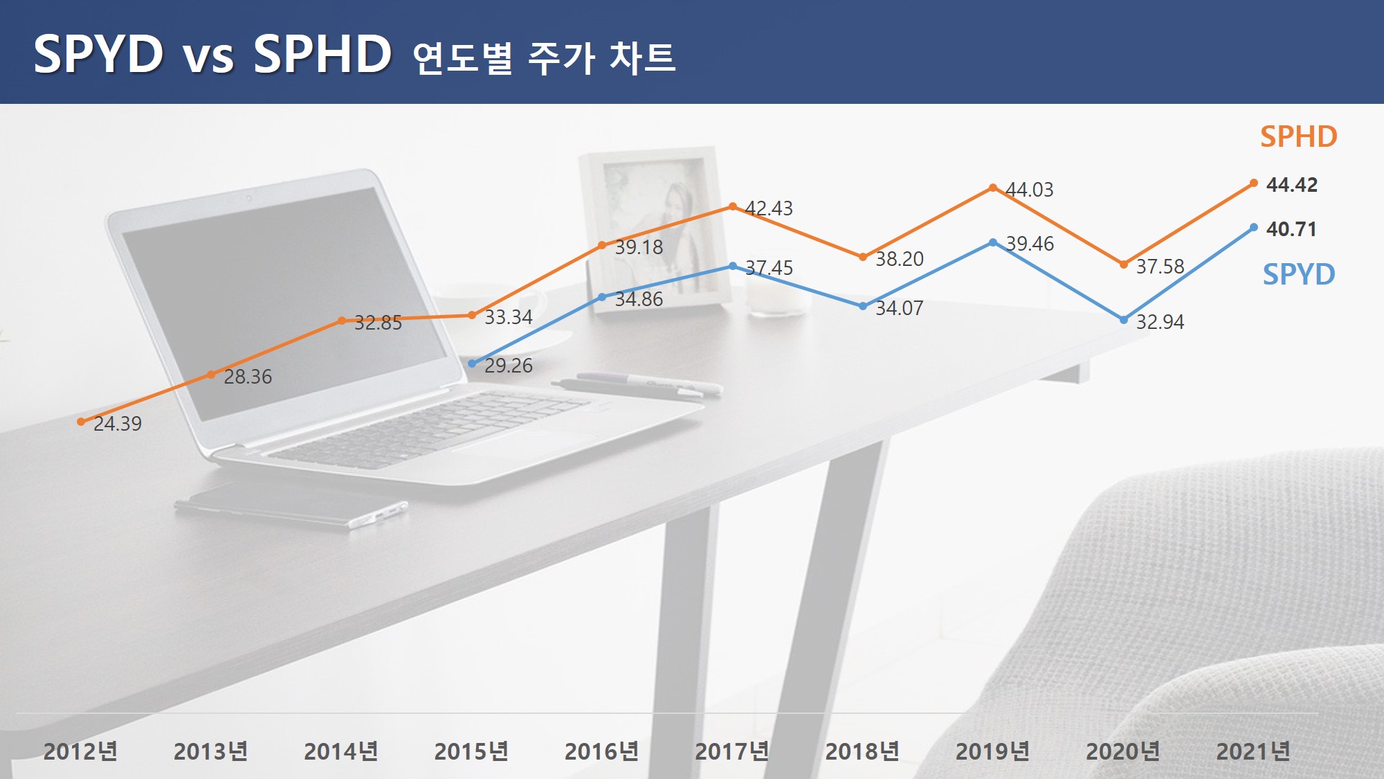 SPYD와 SPHD의 연도별 주가차트를 살펴보겠습니다.