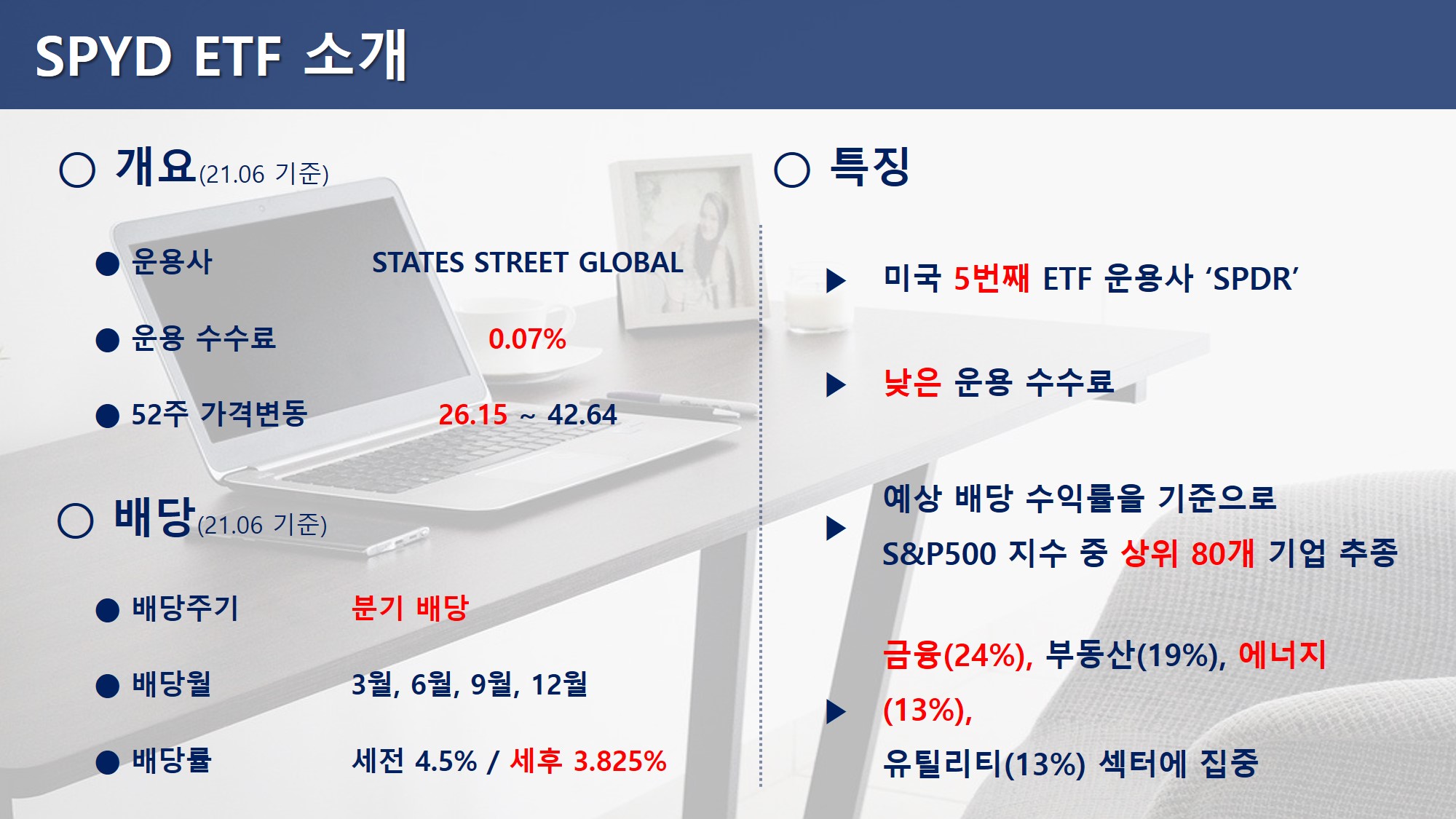SPYD는 미국 5대 ETF 운용사인 SPDR에서 운영하는 ETF로 운용 수수료율이 0.07퍼센트로 매우 낮은 장점이 있고, 세전 4.5퍼센트, 세후 3.825퍼센트라는 높은 배당률을 가진 고배당 ETF입니다.