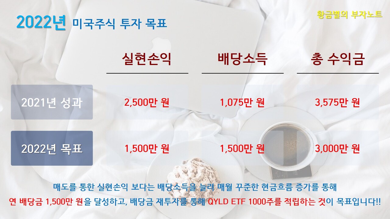 이에 2022년에도 구체적인 목표를 세워서 도전해가고자 합니다. 우선 실현손익은 1,500만 원으로 잡았습니다. 전년보다 낮은 목표를 잡은 이유는 제가 트레이딩이나 스윙 등의 단기매매를 선호하는 투자자가 아니기 때문에 실현손익은 제 의지보다는 시장상황이나 외부 변수가 크다고 판단했습니다. 제가 미국주식 투자를 하는 목적은 배당금을 꾸준하게 적립해서 매월 들어오는 패시브인컴, 시스템 소득을 늘려가는 것이기 때문에 실현손익은 사실 시장상황에 따라 대응해야 하는 부분이라 목표에 크게 의미부여를 하진 않았습니다.