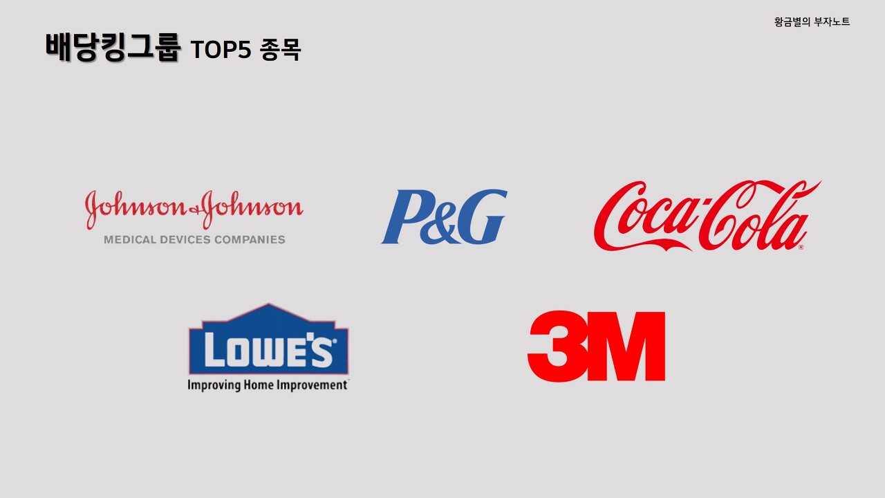 미국을 대표하는 배당킹그룹내 30여개 종목 중에서도 시가총액 기준으로 1위부터 5위까지 기업종목들입니다. 시가총액 1위는 미국을 대표하는 헬스케어그룹 ‘존슨앤존슨’이며, 2위는 세계적인 생활용품기업 ‘피앤지’, 3위는 전 세계인이 사랑하는 음료기업 ‘코카콜라‘, 4위는 미국의 주택용 자재용품을 판매하는 기업 ‘로우스컴퍼니’, 5위는 산업재 섹터를 대표하는 혁신기업 ‘쓰리엠’입니다. 내수산업인 로우스컴퍼니를 제외한 나머지 4개 기업들은 워낙 잘 알려진 세계적인 유명 글로벌 기업들입니다.